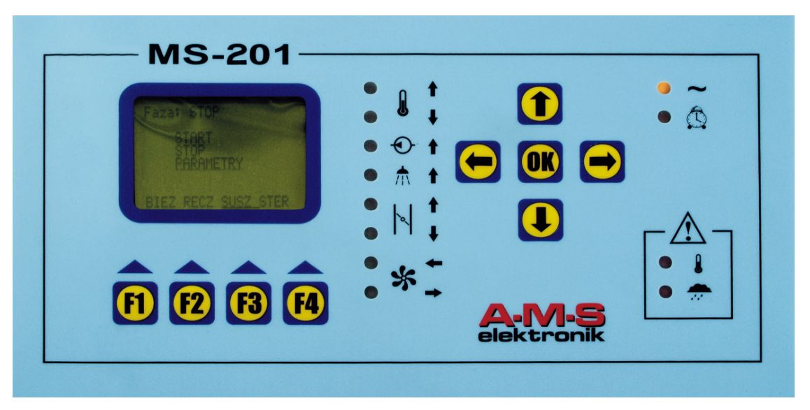 Sterownik MS-201 zapewnia regulację temperatury i wilgotności powietrza w komorze oraz sterowanie rewersyjnymi wentylatorami. Temperaturę w komorze utrzymuje poprzez sterowanie zaworem regulującym przepływ czynnika grzewczego [dwudrogowym lub trójdrogowym].